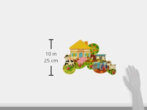 Liefdevol vormgegeven wandgarderobe met 5 kledinghaken, in kindvriendelijk, kleurrijk design met dieren die op een boerderij leven, een huis, appelboom en tractor, afmetingen ca. 37 x 24,5 x 6,5 cm