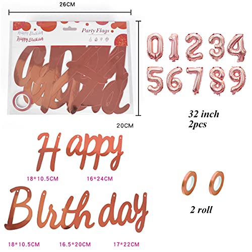 Pakket: 2 stuks roségoudkleurige 32 inch cijferballonnen (niet opgeblazen), 2 banden en 1 x Happy Birthday-vlag.