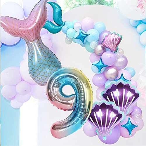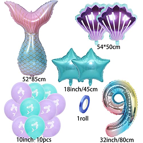 16 stuks zeemeermin verjaardagsdecoratie: 1 x XL 32 inch getallenballon (ca. 70 cm), 1 x zeemeerminstaart-ballon (ca. 50 x 75 cm), 2 schelpfolieballonnen (ca. 50 cm), 2 x ster ballon (ca. 45 cm), 10 x latex ballon. (ca. 30 cm) en 1 band.