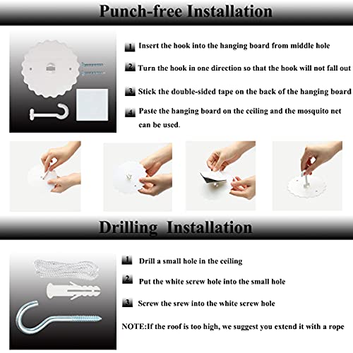 ⭐【 2 installatiemethoden】 1. De meegeleverde plafondhaakset maakt montage mogelijk door zelfklevende haken. 2.Je moet perforeren om schroefhaken te installeren.Als het plafond hoog is, is het raadzaam om een touw aan te sluiten.
