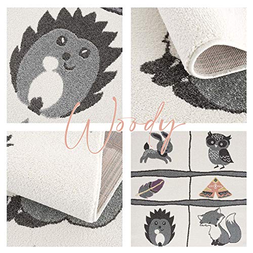 Dit schattige ronde tapijt voor de kinderkamer onderscheidt zich door zijn leuke kindervriendelijke design. Verschillende kleuren zoals grijs, geel, wit, zwart, oranje, paars, blauw en groen maken hem tot een heel bijzondere decoratie en een blikvanger in elke kamer. De verschillende dieren uit het bos – haas, uil, egels en vos – een tent en een veer, verschillende vormen en patronen, brengen kinderogen tot stralen en nodigt tegelijkertijd het kind uit om te dromen.